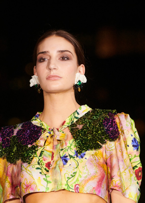 Hosenrock und Top aus bedrucktem Viskose nach eigener Malerei. Detail – abnehmbarer Kragen aus Haute-Couture-Spitze mit Pailletten.