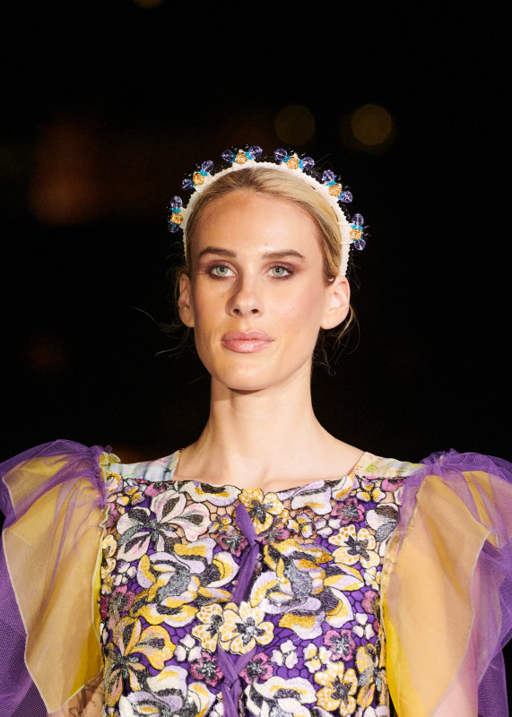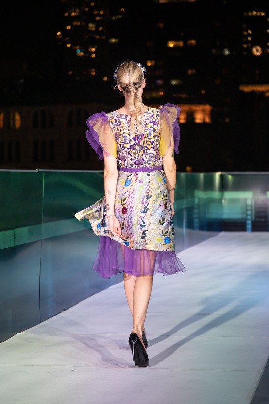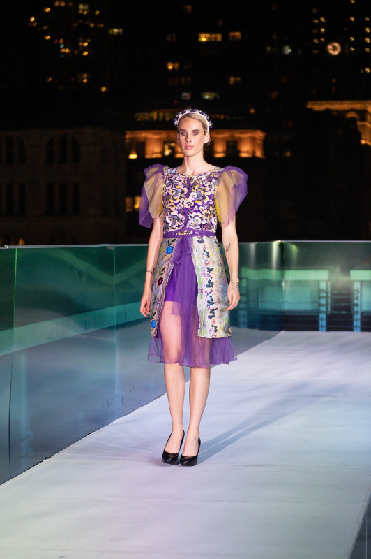 Kleid mit Druck eines eigenen Kunstwerkes auf Stoff, ergänzt durch Haute-Couture-Materialien.