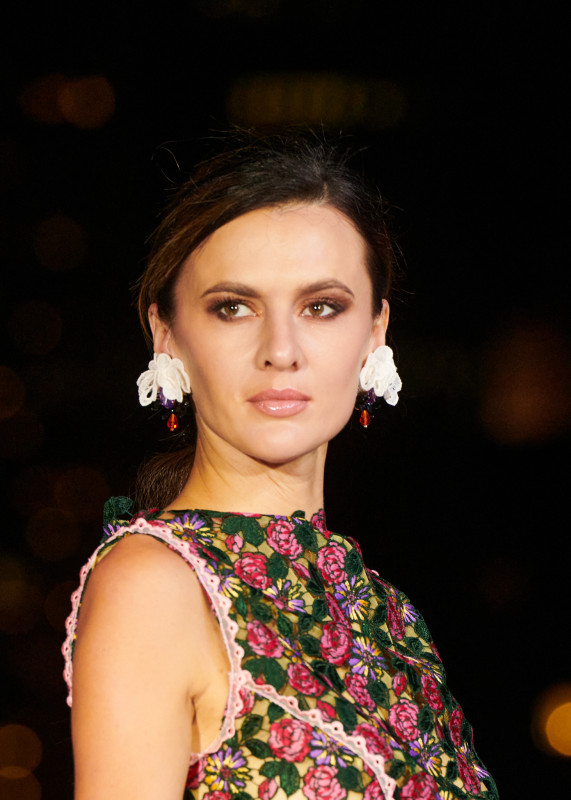 Rock aus Stoff mit eigener Malerei, kombiniert mit einem Top aus edler Haute-Couture-Spitze.